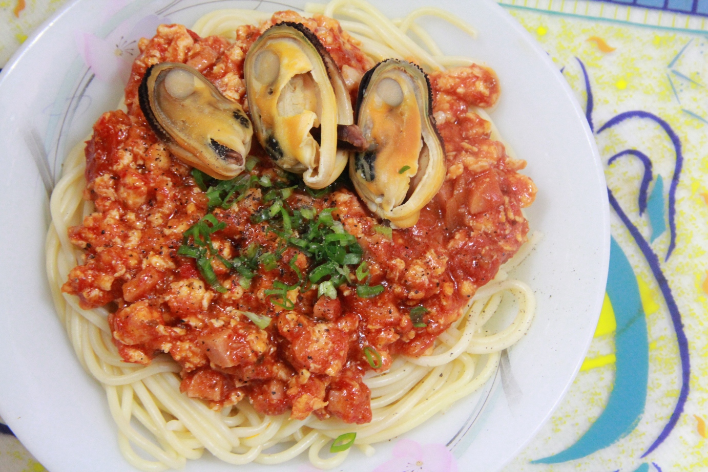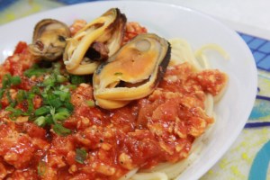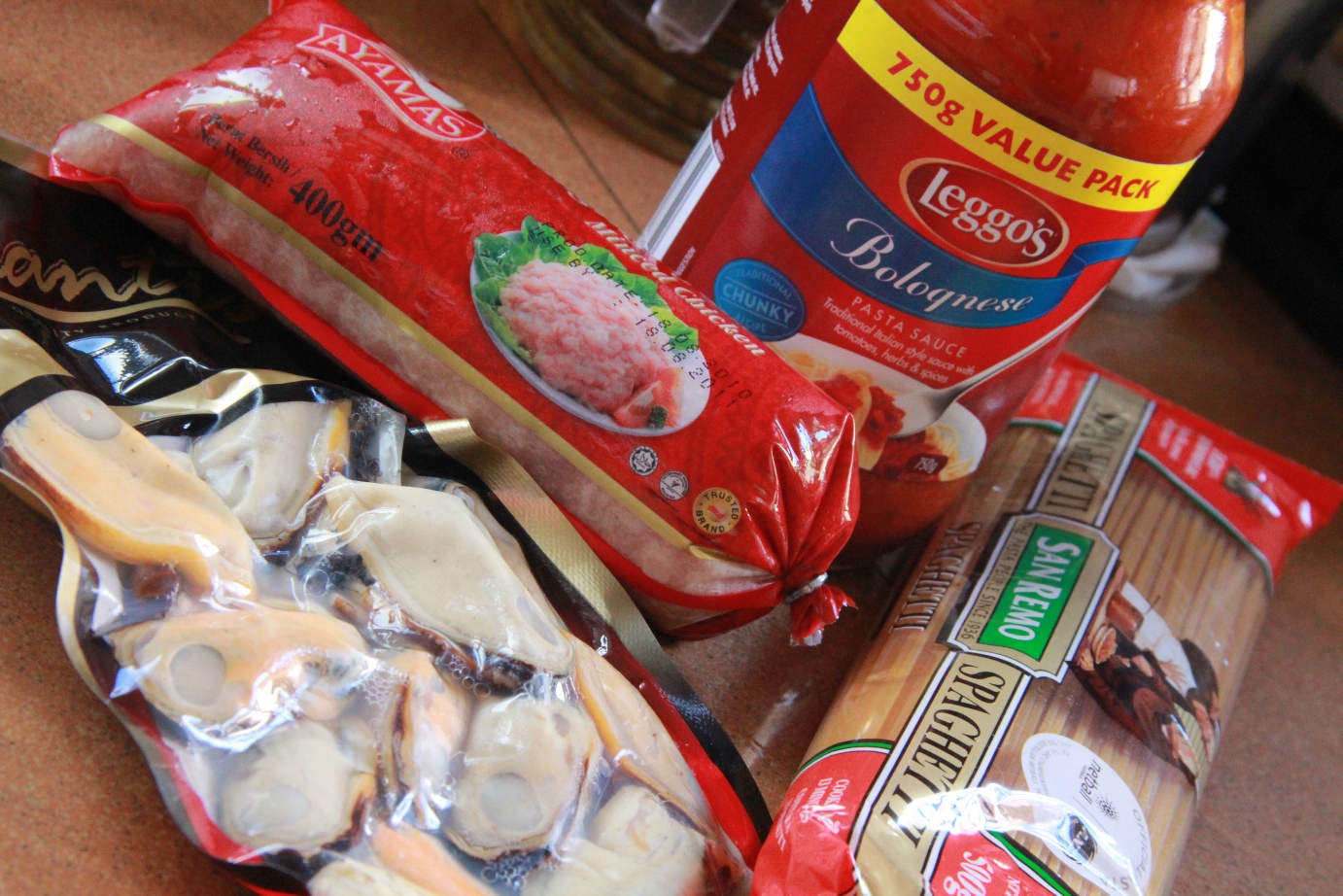 It’s so convenient nowadays. You can prepare a good meal with all the convenient stuff sold in supermarket. (good for lazy people like me..blek). I cooked a simple dinner yesterday night. I’m preparing stuff for my spaghetti bolognese here. Got the tomato puree with herbs well-packed in a bottle, specially for spaghetti. A packet of mussel, a pack of minced chicken meat and a packet of spaghetti. Got it all from the supermarket.