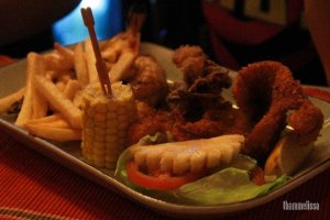 Combination of grilled king prawns, fish fillet, grilled squid, fried soft crab and fried scallop served with french fries and mini salad
