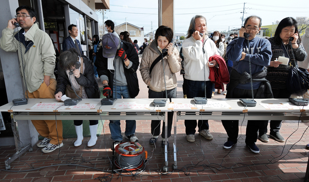 People waiting for their turn to make phone calls using the temporary phones set up for residents at the Natori City Hall in Natori. From this photo; I can see how discipline the Japanese are.