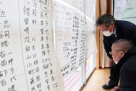 Survivors at evacuation center in Rikuzentakata checking through the list of people missing.