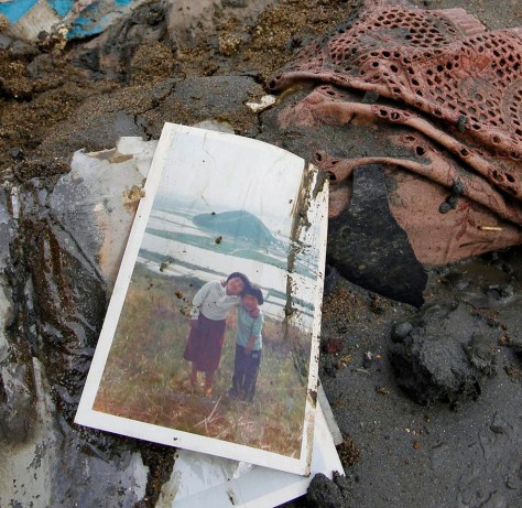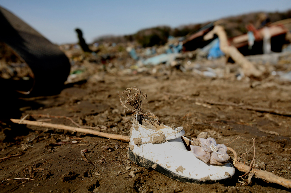 A girl’s shoe sits in flood debris, Fukushima, Japan.
