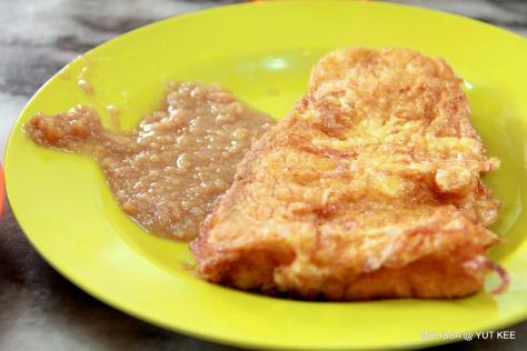 An egg batter bread sandwiched with shredded pork and onion. Some said with Chinese sausage and crabmeat. But I couldn’t taste it ler..