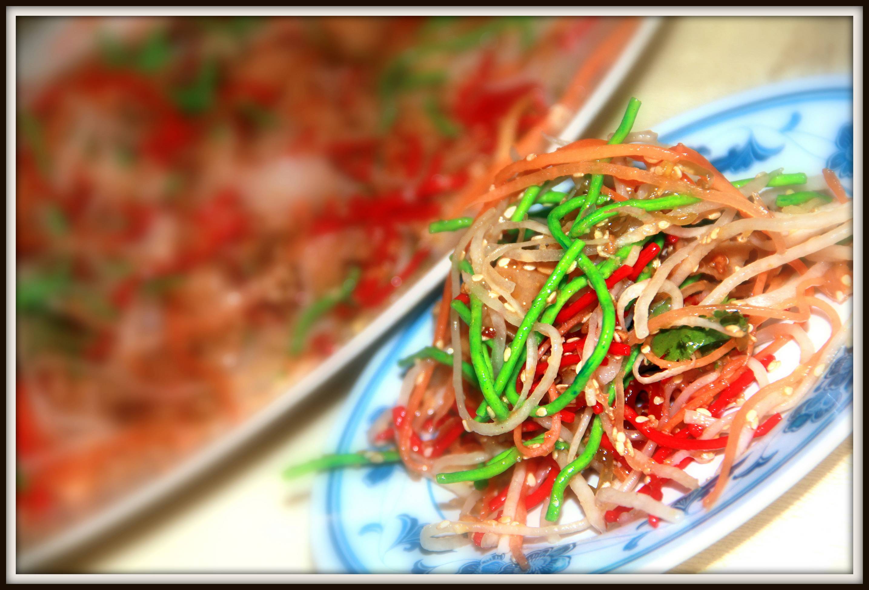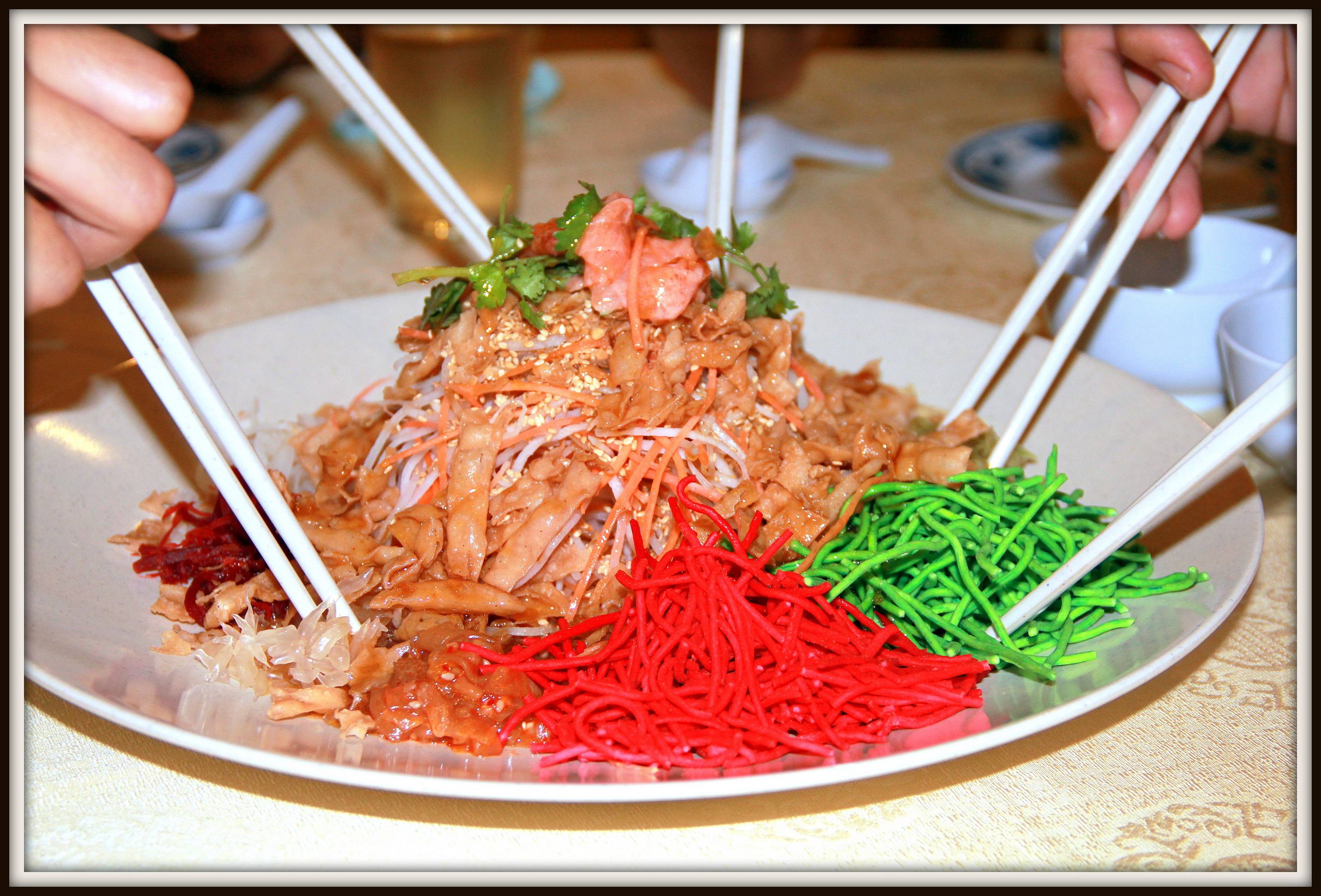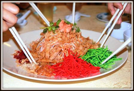 Yee Sang (Prosperity Toss), an auspicious dish during Chinese New Year. Colorful and crunchy crackers, pickles, pomelo, thin salmon slices. All these are mixed with the plum sauce.