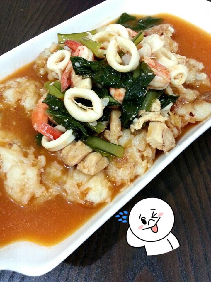 b) Add some more oil in the wok, and start frying some garlic in it. Add the chicken meat, prawns and sotong and fry till semi cooked.